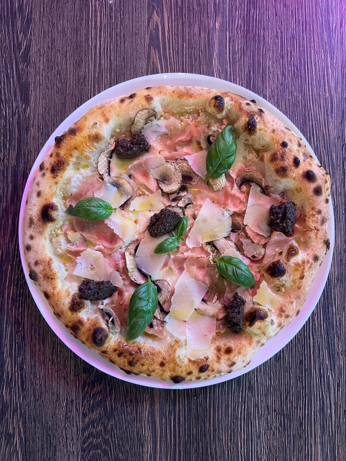 Blat de pizza napoletan, cremă de ciuperci, mozzarella fior di latte , ciuperci, prosciutto cotto, s..