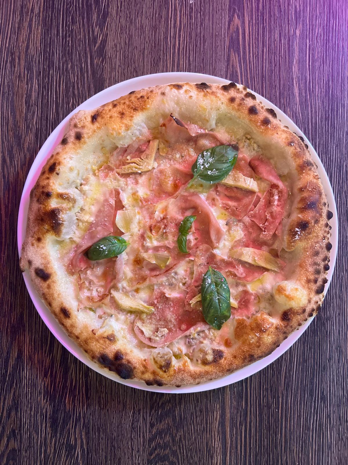 Blat de pizza napoletan, crema ciuperci, mozzarella fior di latte, speck afumat, anghinare, ulei d..