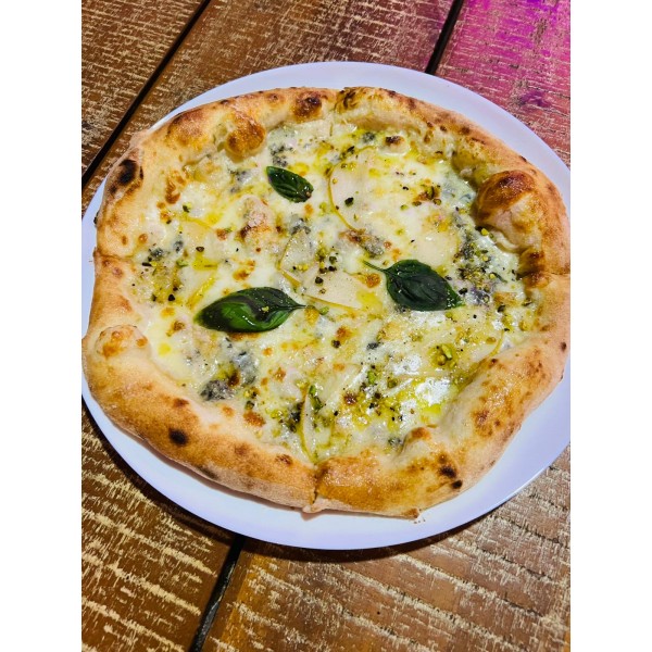 Blat de pizza napoletan, sos rosii, mozzarella fior di latte, salam ventricina picannte, ule..