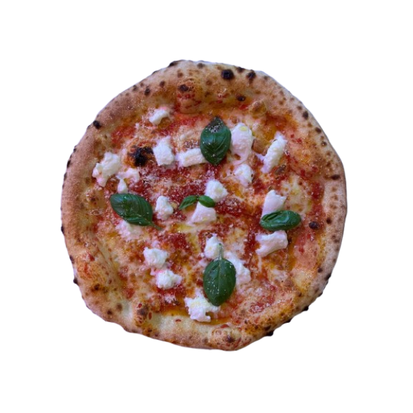 Blat de pizza napoletan, sos roșii, mozzarella fior di latte, mozzarella proaspată bocconcino, grana padano maruntit, ulei de măsline extravirgin și busuioc proaspăt