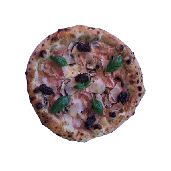 Blat de pizza napoletan, crema ciuperci, mozzarella fior di latte, speck afumat, anghinare, ulei d..